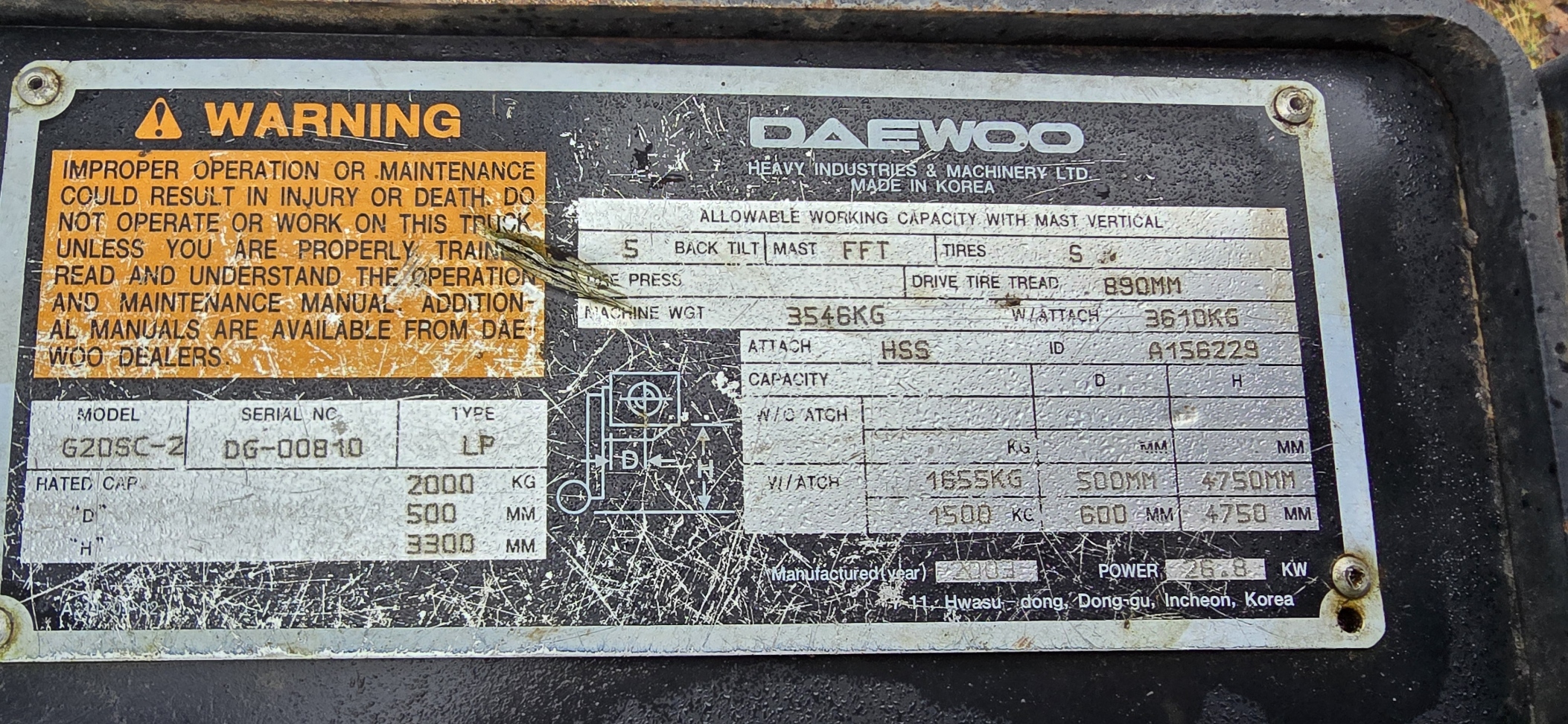 Tõstejõud 2000 kg, tõstekõrgus 4750 mm, kolmeosaline mast vabatõstega, kolmas hüdroliin, kahvlite pikkus 1200 mm, , täisrehvid, G420 mootor(kapitaalremont 2025), väljalaskeaasta 2003, töötundide arv 4305 h, seerianumber DG-00810. Korralik masin